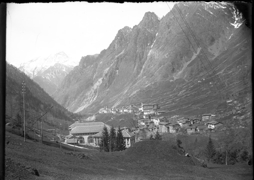 In primo piano la centrale idroelettrica di carona attiva dal 1924,e la costruzione della diga che creerà il lago artificiale di Carona (1927/1931). Sullo sfondo si vede la chiesa del paese priva di campanile che verrà ultimato nel 1939